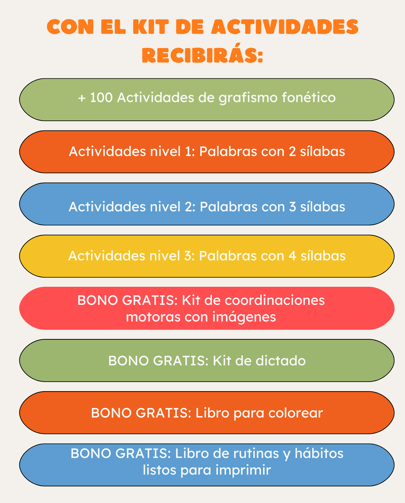 👉 Tienes 7 días completos para explorar todo el contenido del Kit de Grafismo Fonético, realizar las actividades con tu hijo y comenzar a notar sus primeros avances.